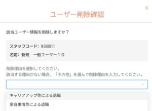 WEBユーザー機能での、ユーザー削除時、削除理由の選択、入力を行うように改修しました。