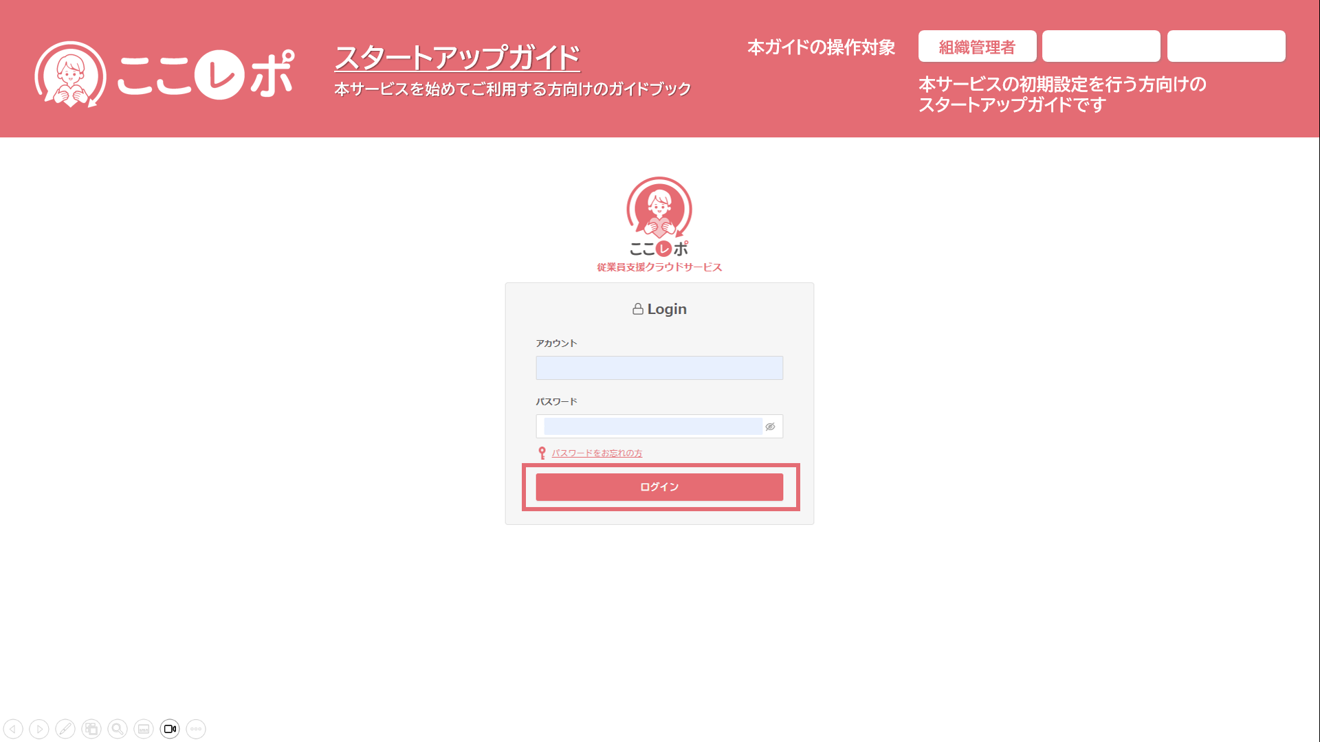 「ここれぽ」ユーザー登録完了のお知らせに記載されているアカウント、パスワードを入力して「ログイン」をクリックしてください。