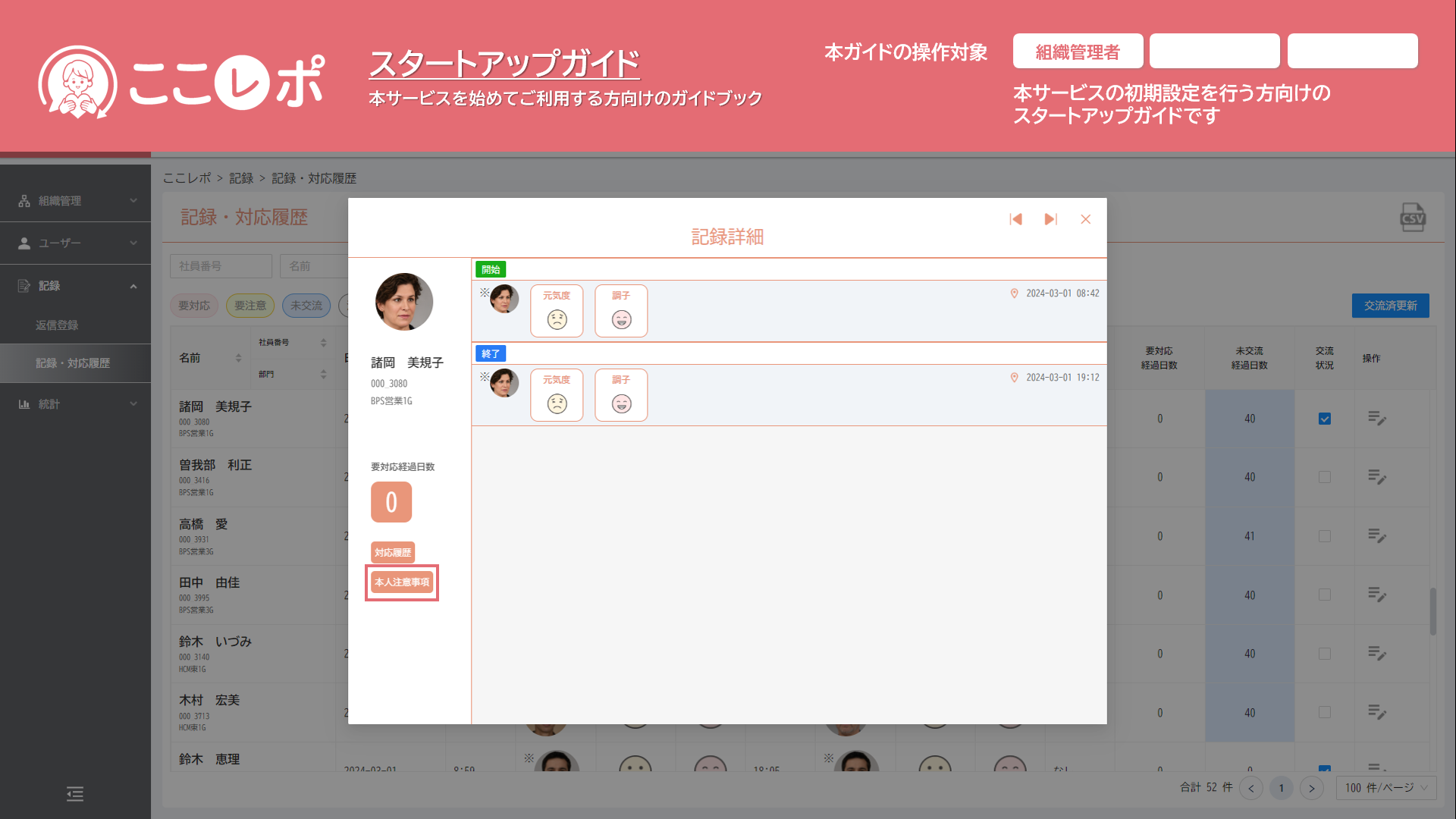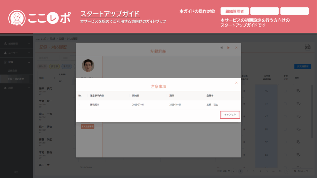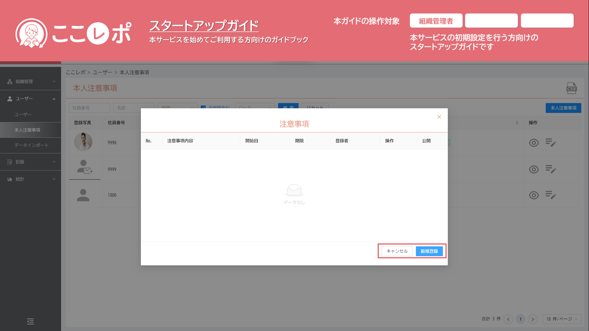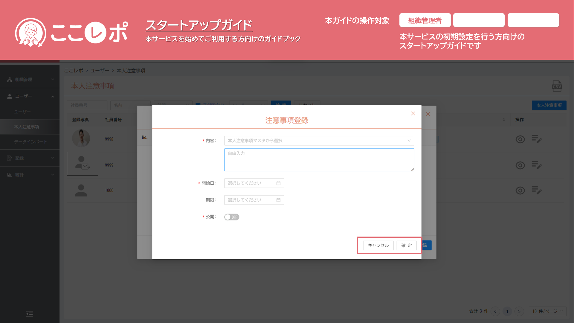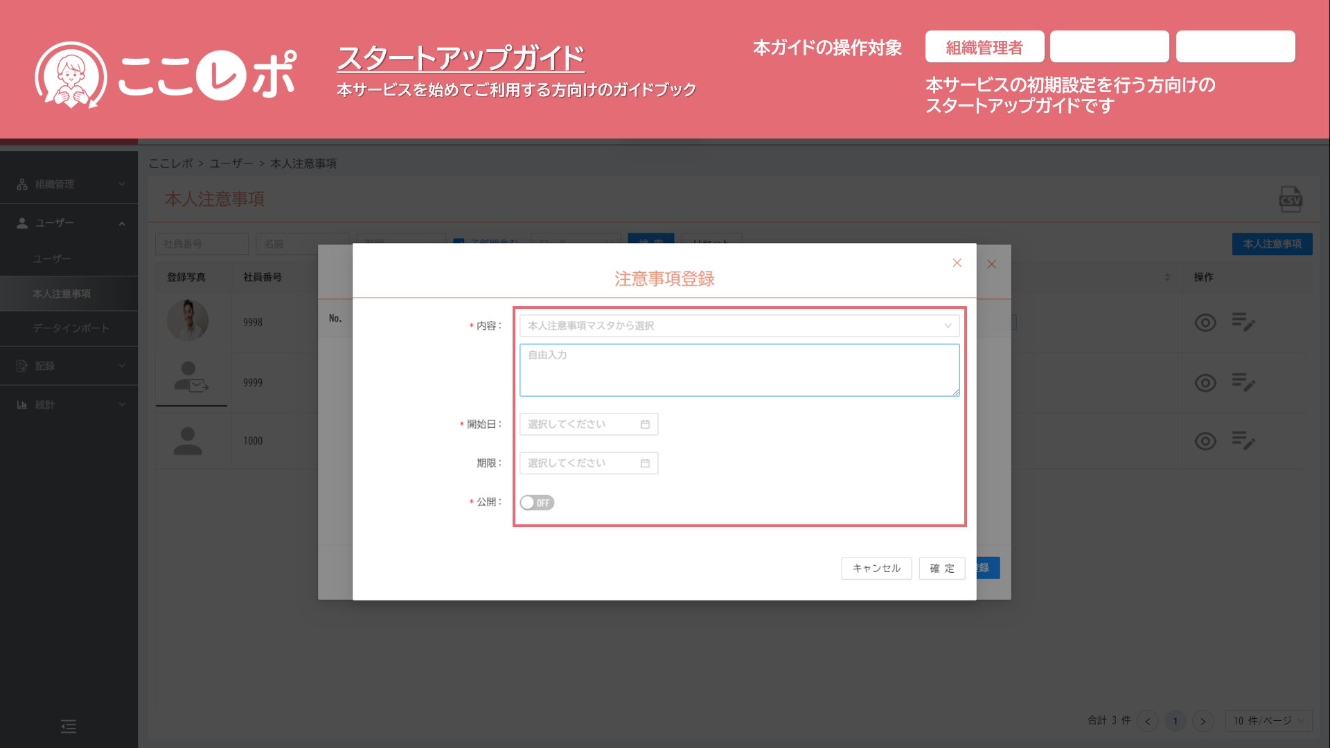 本人注意事項ではユーザーに関する注意事項等を登録できます。ユーザーに対して、管理者が気にかけておく点などを登録してください