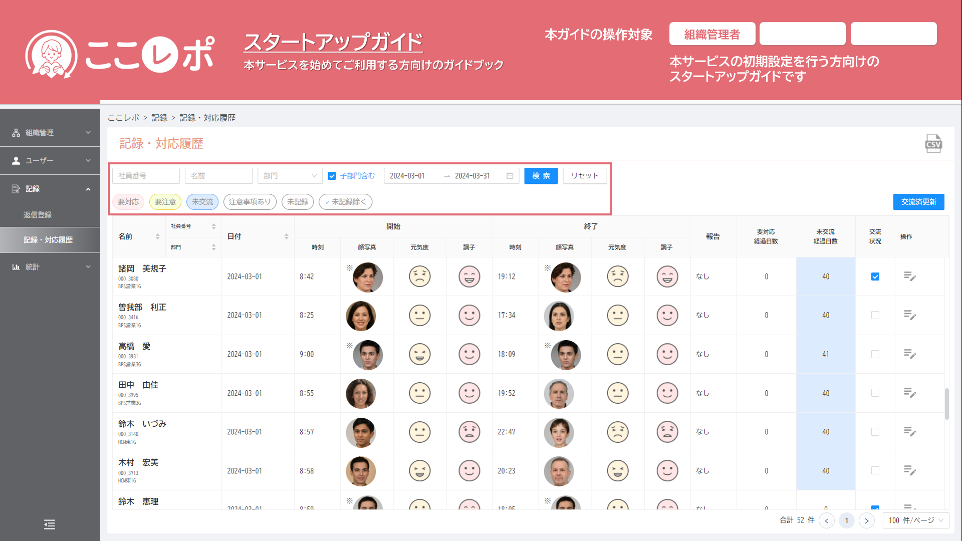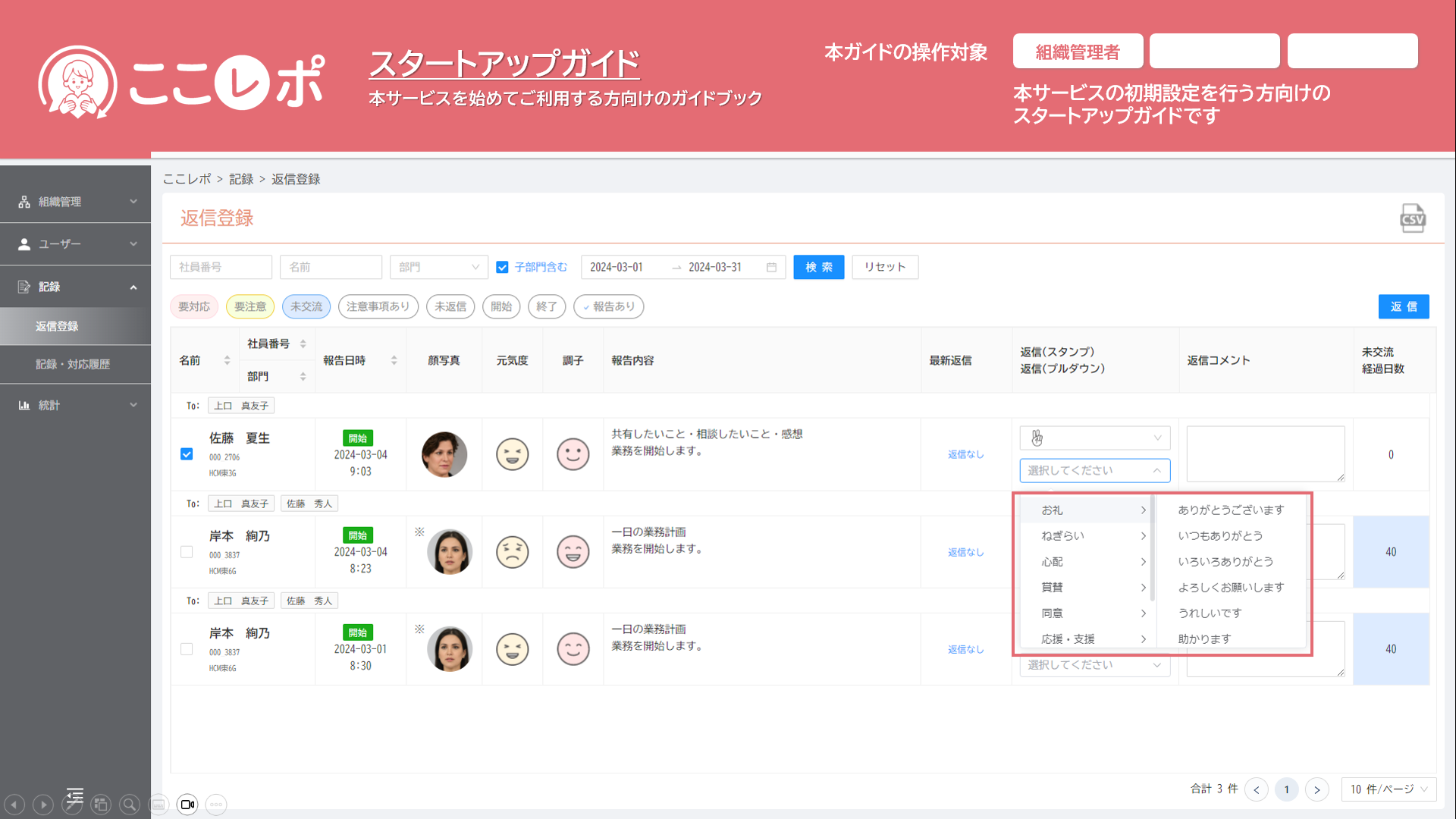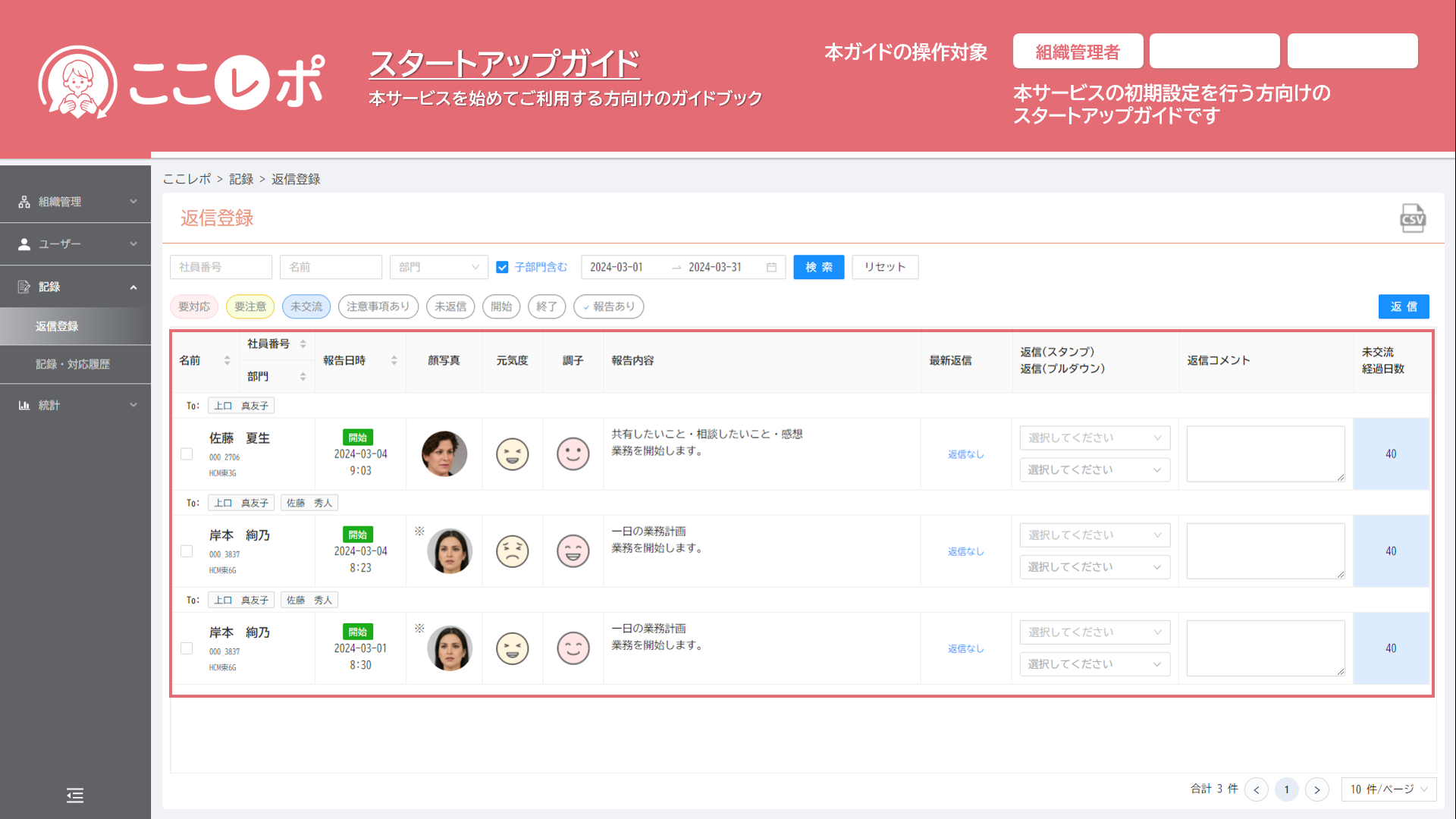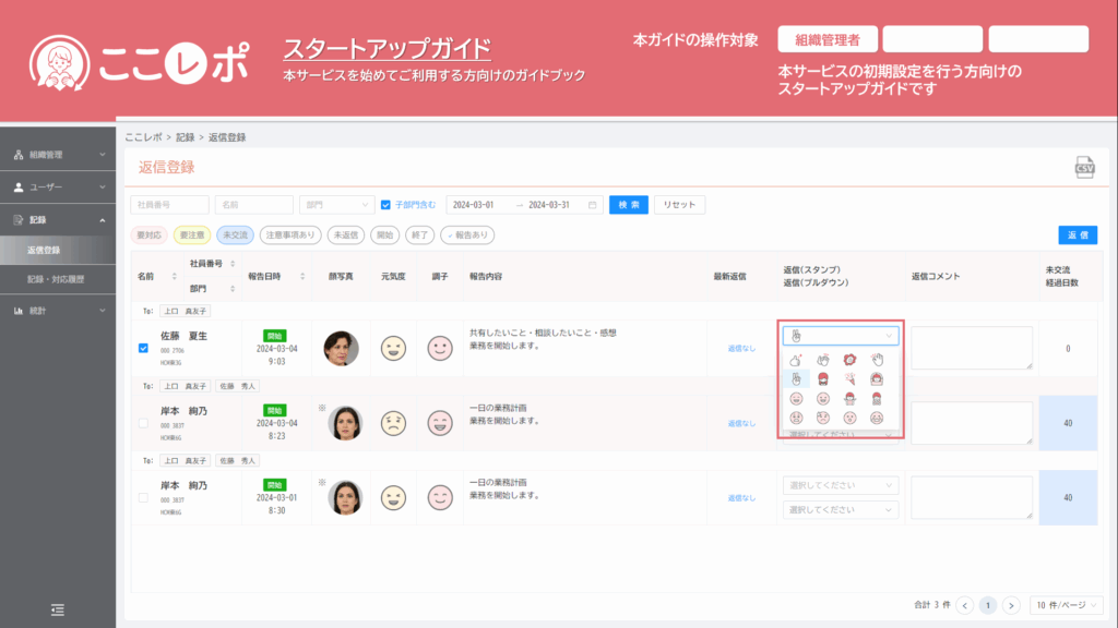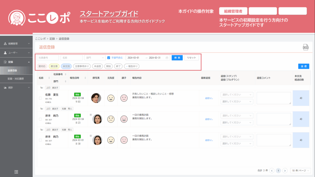 記録の確認と返信。この機能は日時的に使用する機能です。ユーザーのサーベイの回答状況、報告などを確認できます