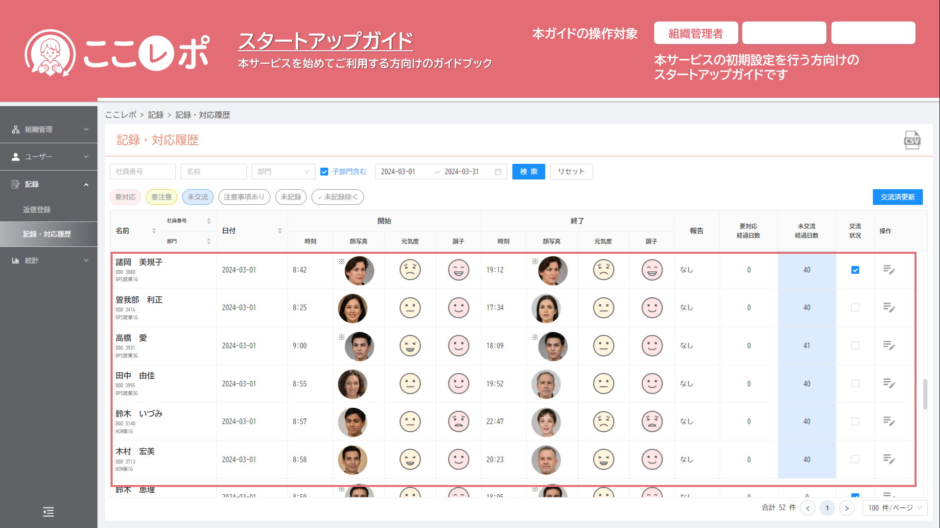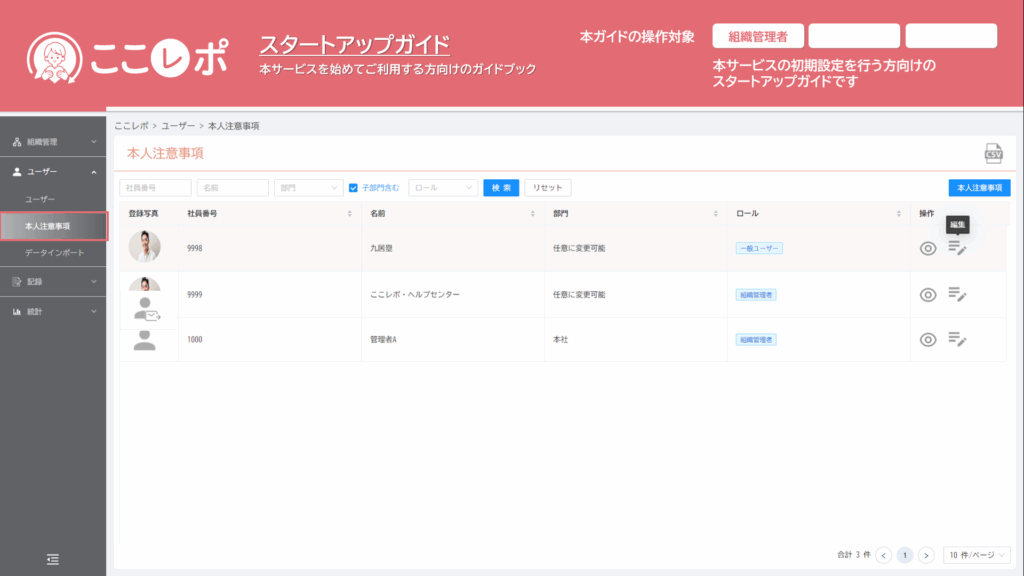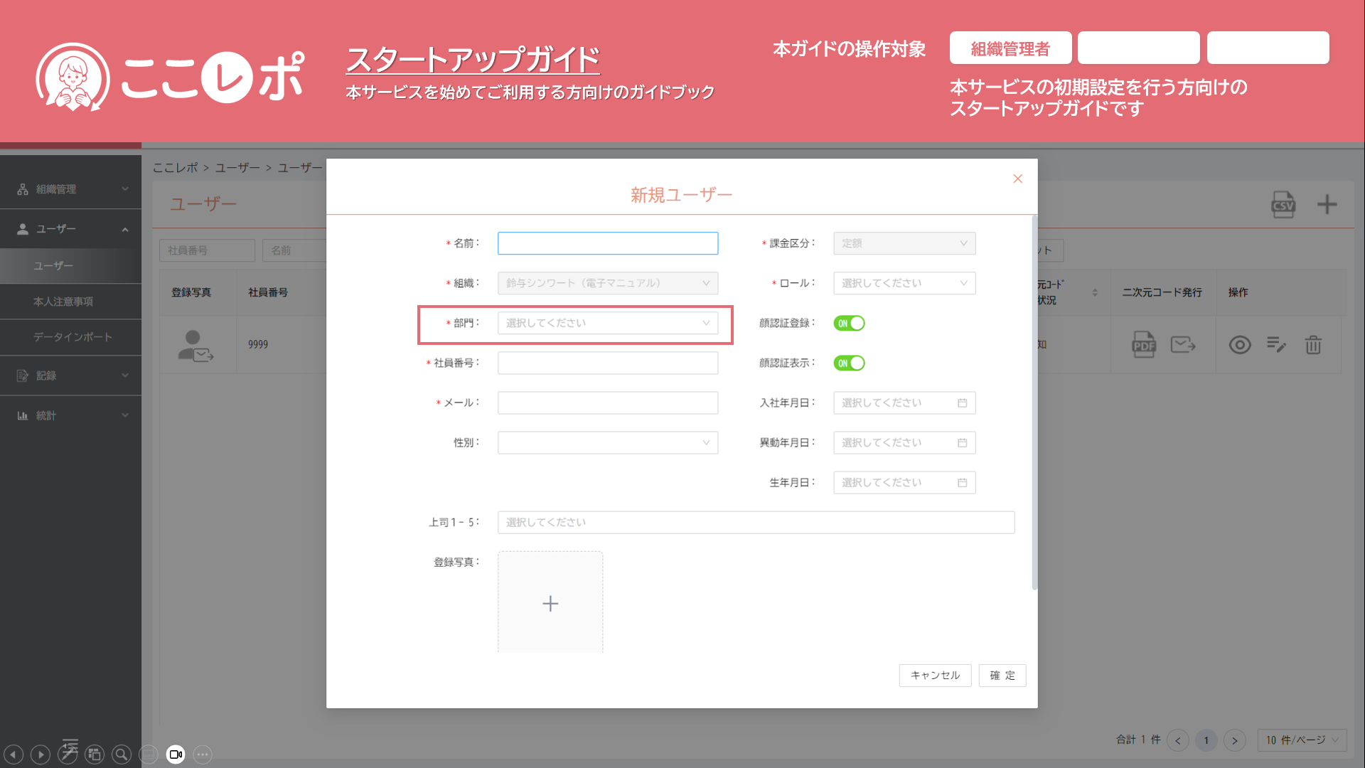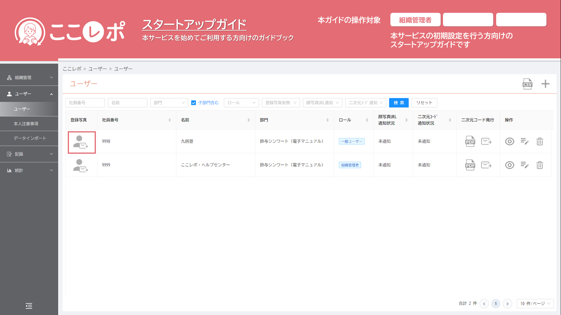 ユーザーの作成、編集、記録の確認などを利用可能です。拠点長、部門長などを部門管理者で登録してください。