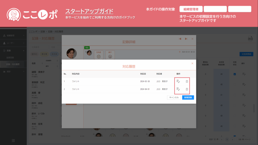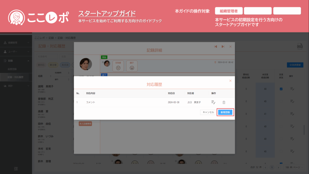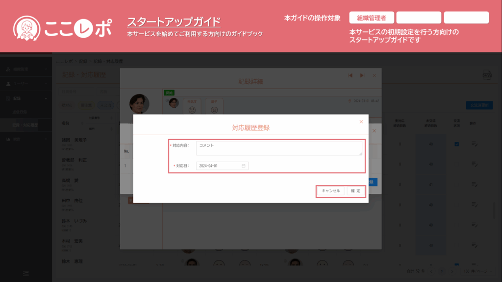 対応履歴の登録方法についてご案内します。ユーザーにフィードバックした内容を登録いただけます