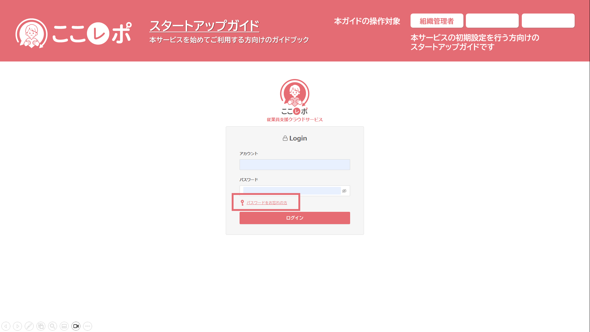 パスワードが分からなくなってしまった場合、パスワードのリセット操作をログイン画面から行えます