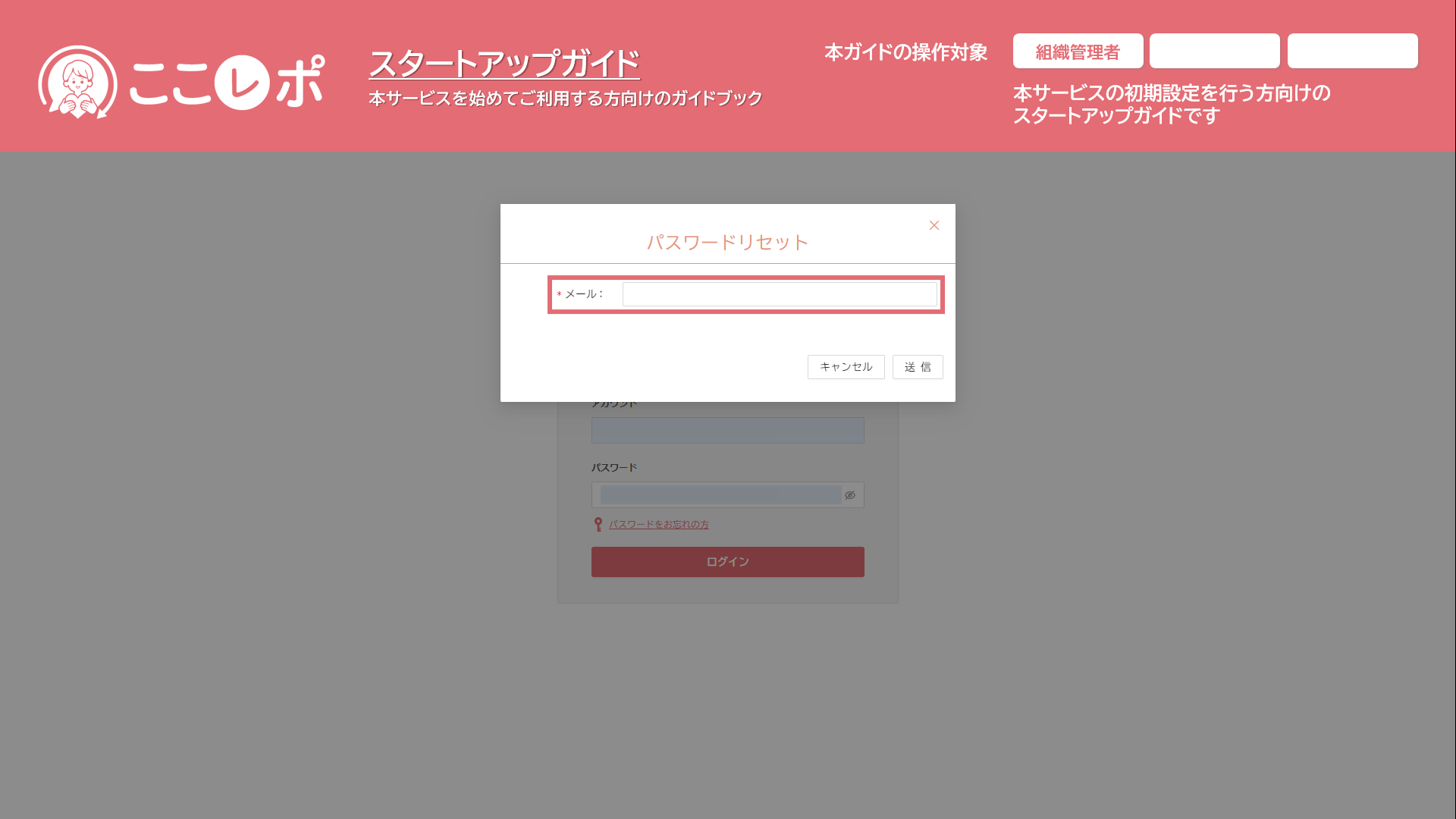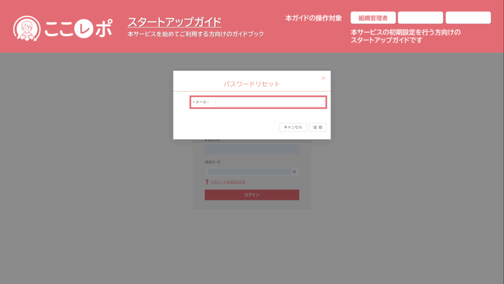 パスワードリセット画面が表示されたら、メールアドレスを入力して「送信」をクリックします。