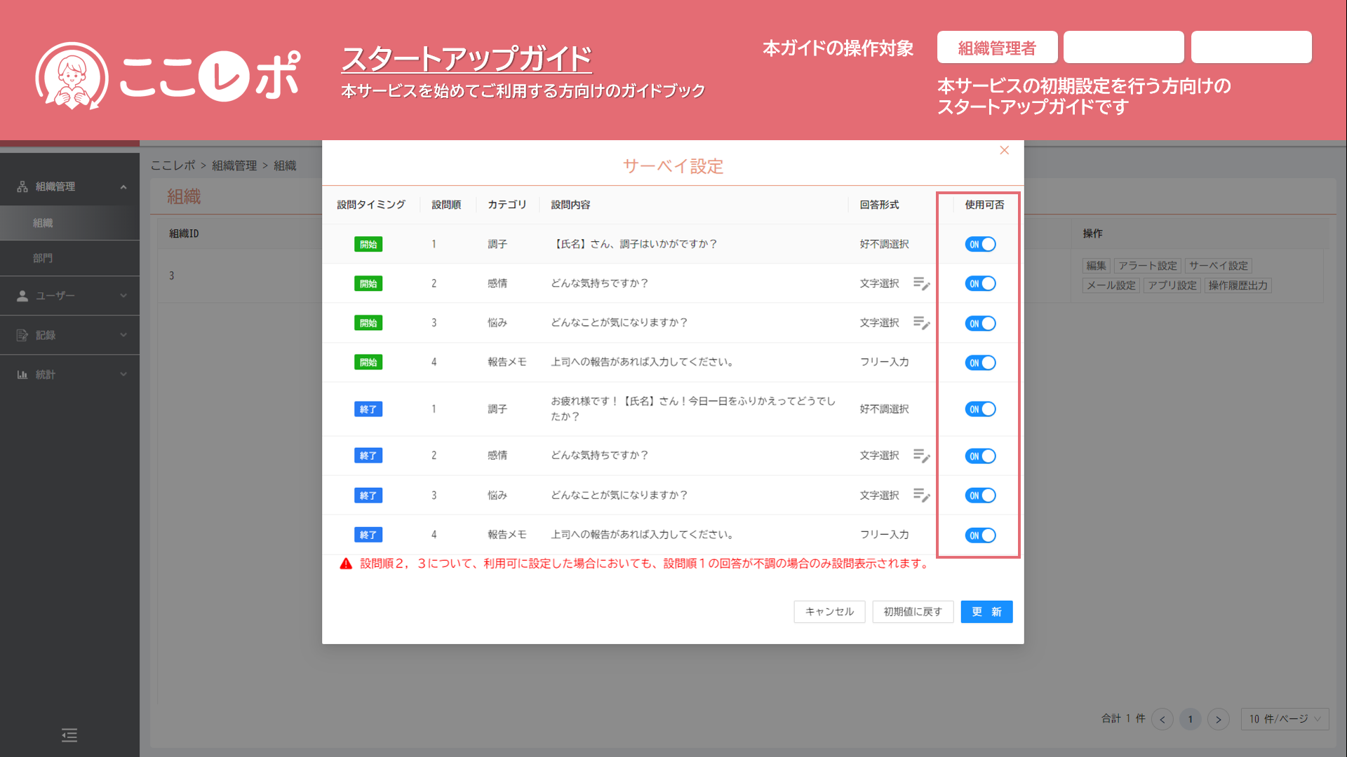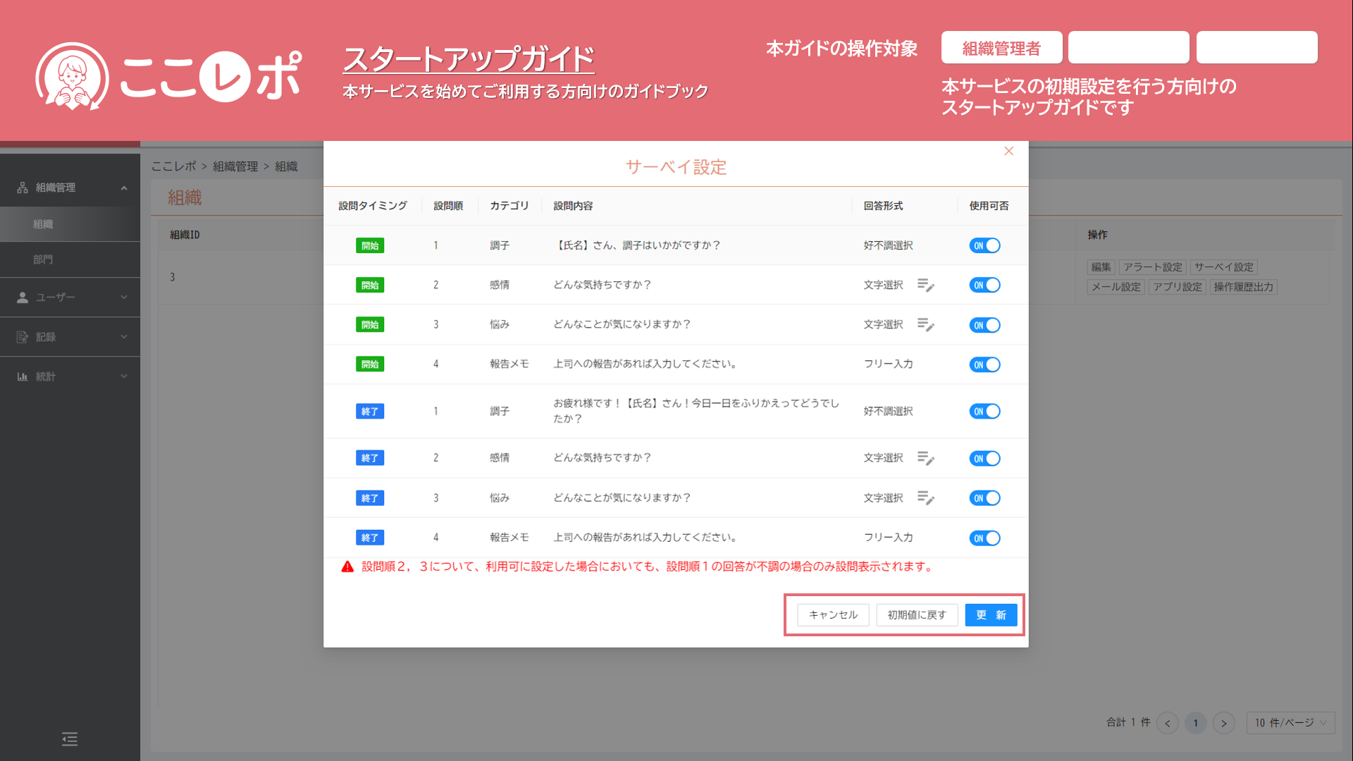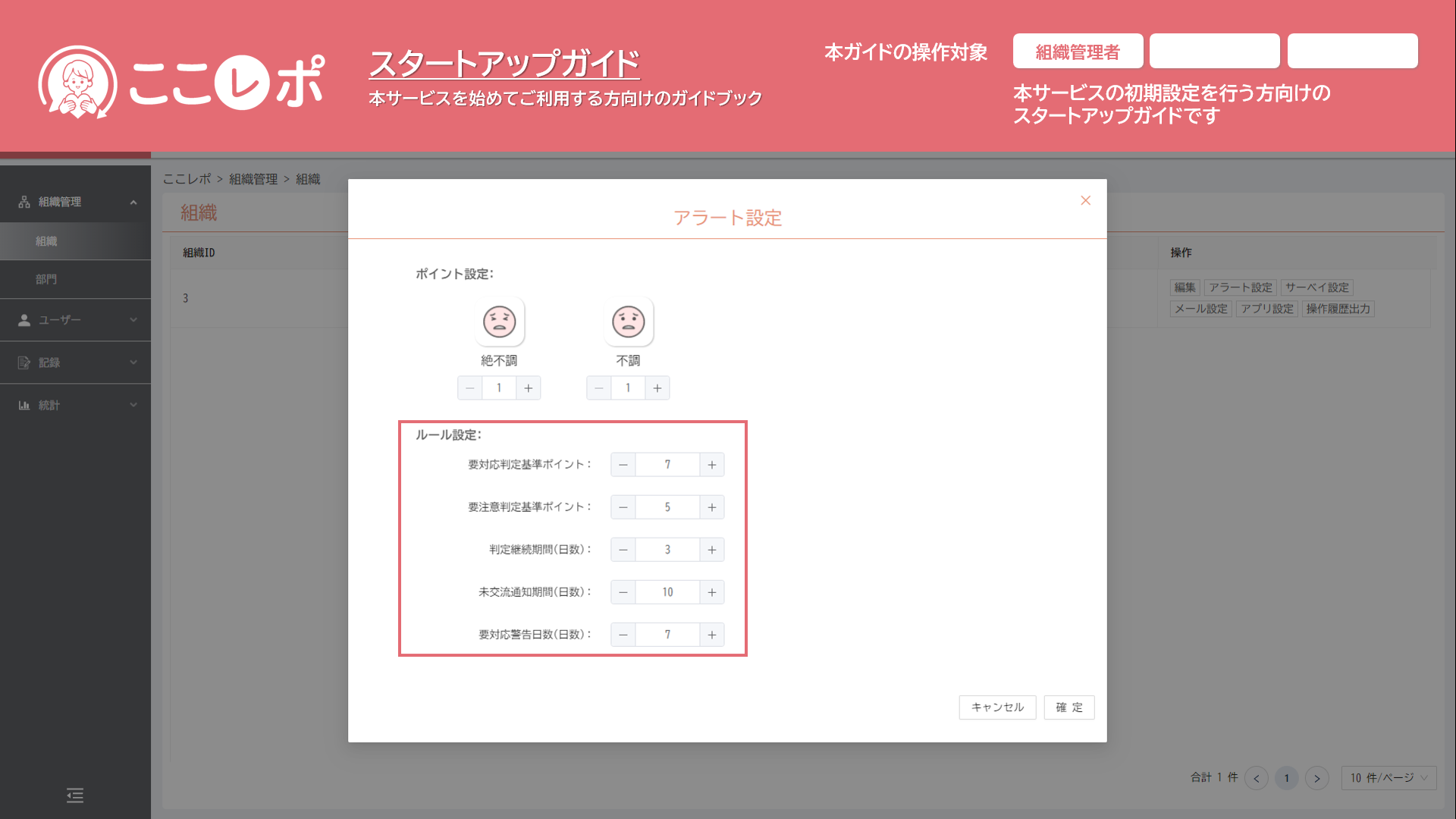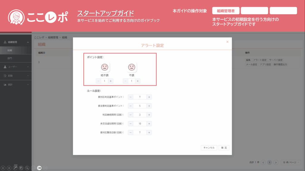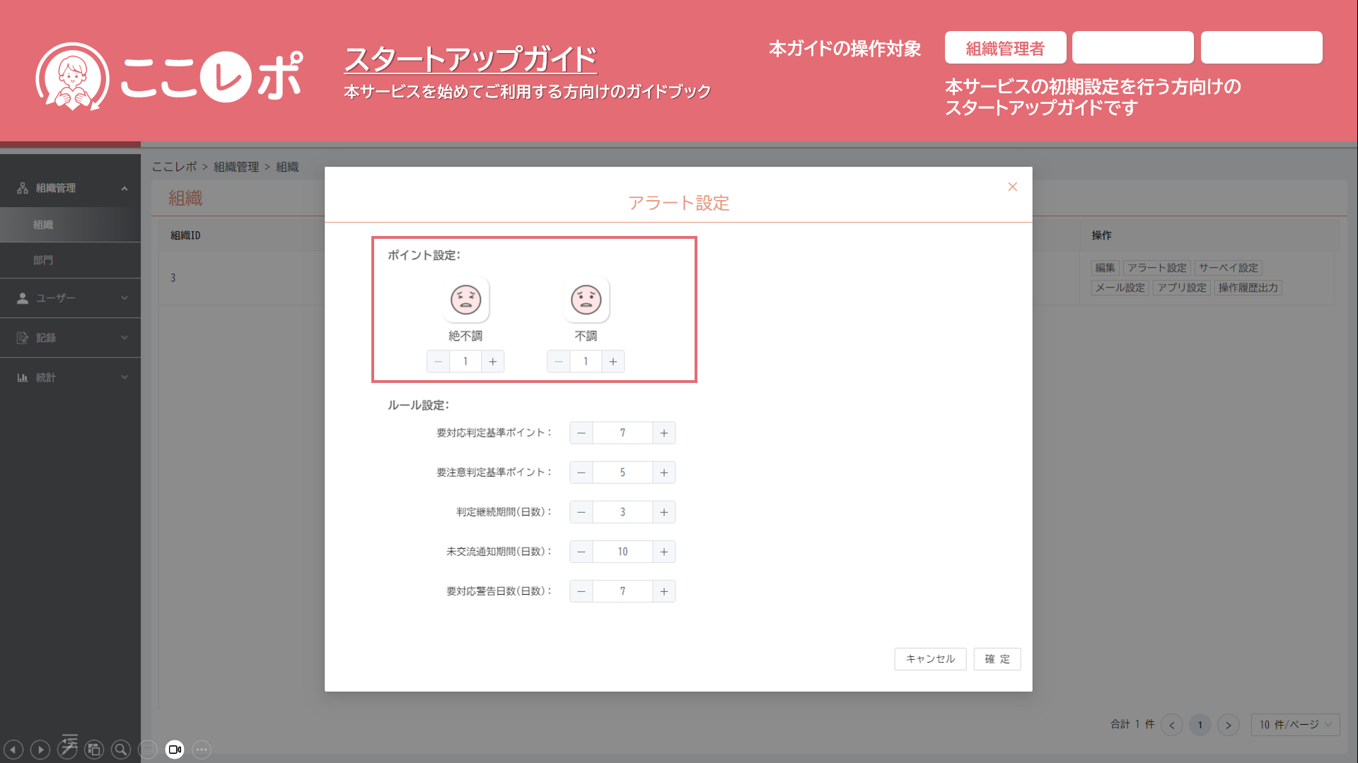 ユーザーが「絶不調」および「不調」を報告した場合のポイントを設定します。このポイントの蓄積で管理者に通知を行います。ポイントが高いほど、管理者への通知は早くなります。このポイントをいかに設定するかが、より早い気づきのポイントとなります。逐次ポイント設定のチューニングをいただくようお願いいたします