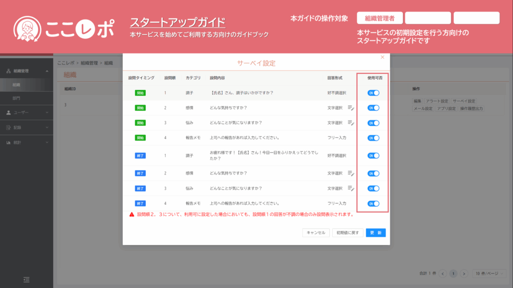 サーベイ設定ではサーベイで表示する設問の設定を行います