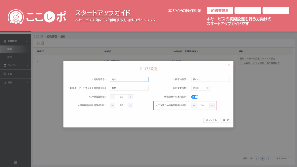 ユーザーがアプリを初期登録するための「二次元コードL」の有効期限を設定します。この期限を過ぎた二次元コードは使用できなくなり、再度後述するユーザー画面から、「二次元コード送信」を行う必要があります