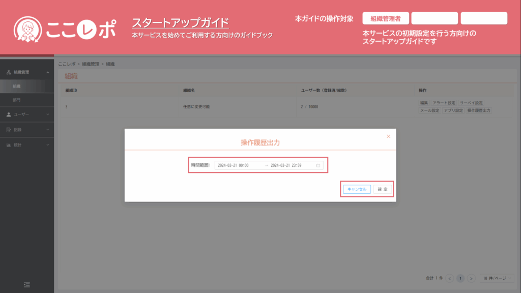 操作履歴出力では本サービスで行った操作履歴を表示します