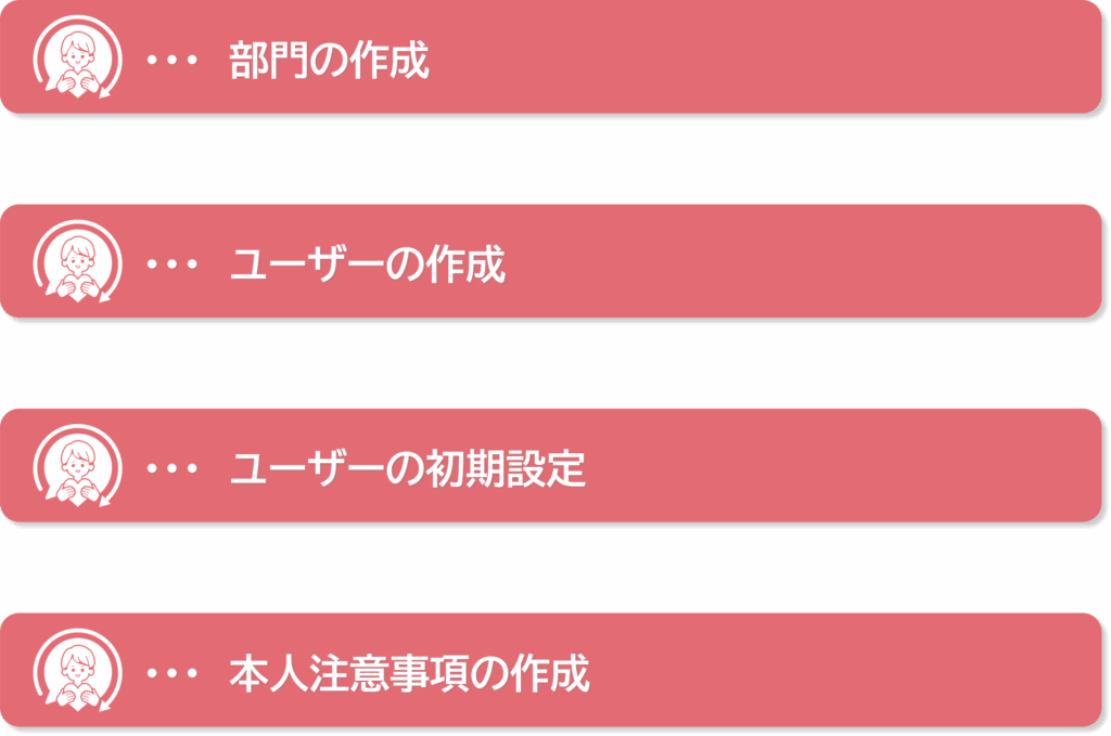 部門(任意)、ユーザーの作成が必要です。その設定方法についてご案内します。また、ユーザー側でも初期設定が必要です。「部門」のみ「組織管理者」だけが設定可能です。ユーザーの作成、初期設定は部門管理者の方も操作いただけます。