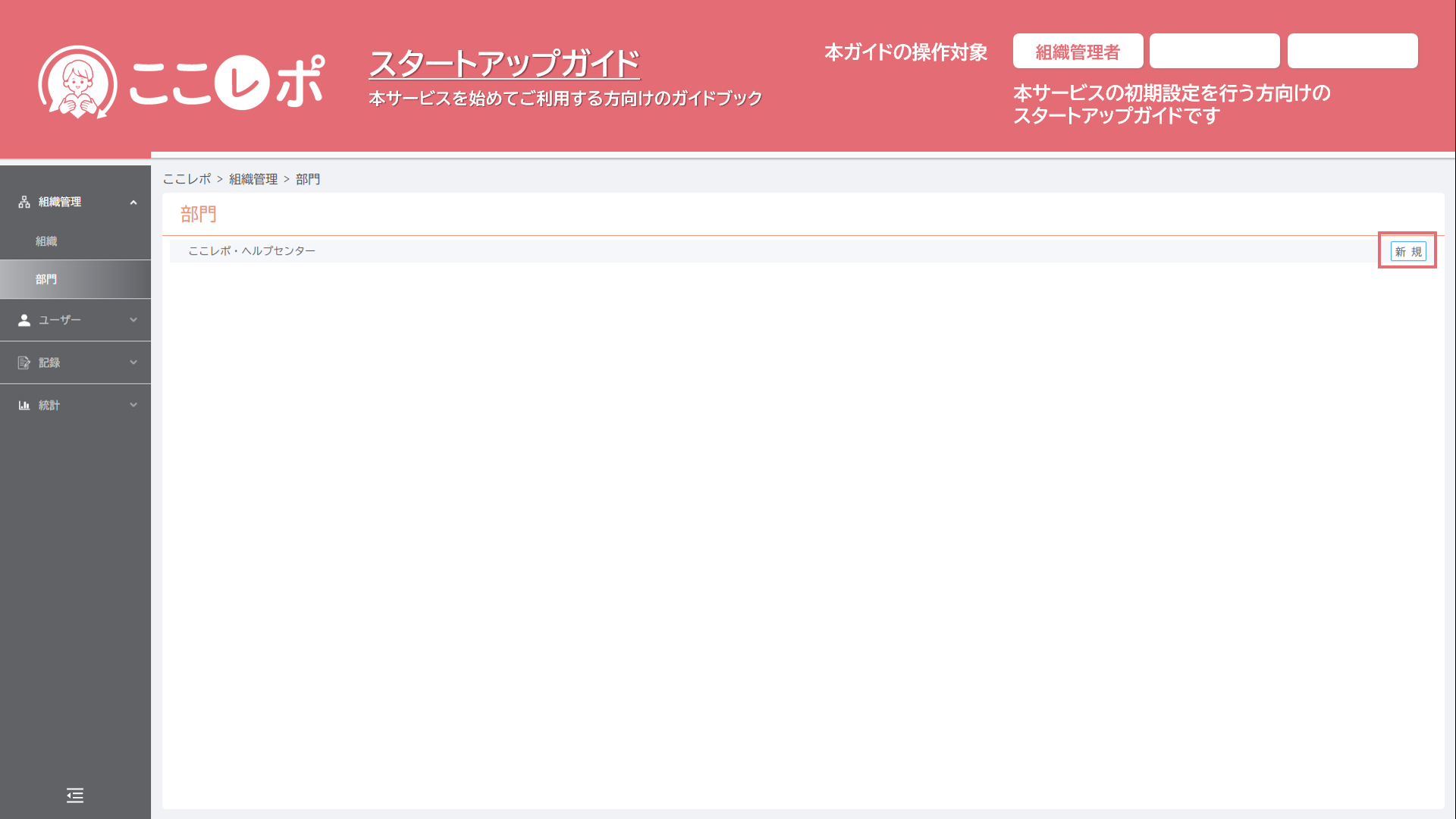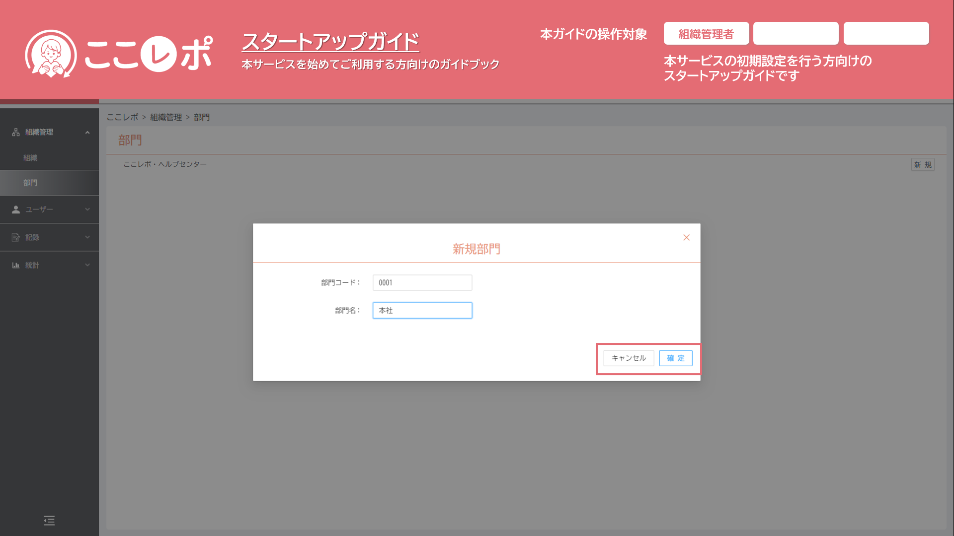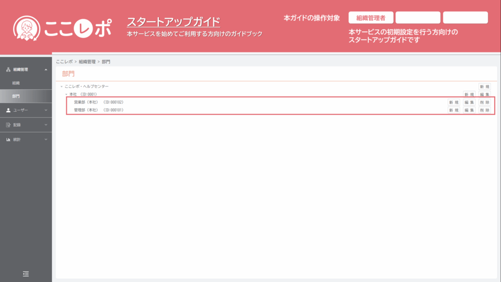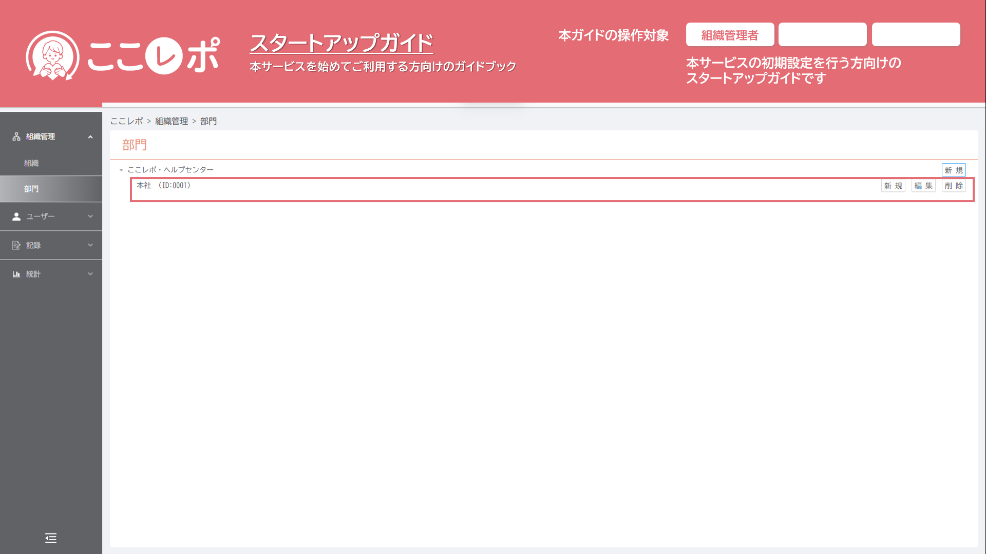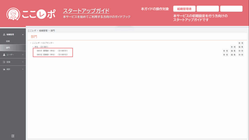 部門の作成ではユーザーの所属部門の作成・編集・削除を行います。部門を作成することで、記録の表示の制限が可能です。