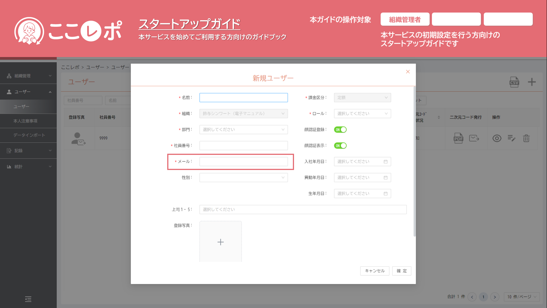 ユーザーのメールアドレスを登録します。メールアドレスは重複できない項目です。1人1アドレス必要です。登録したメールアドレスに、顔写真登録用のメール、アプリ初期登録用のメール、管理者には通知メールが送信されます。