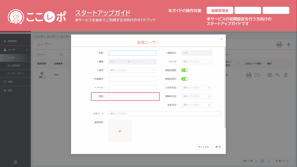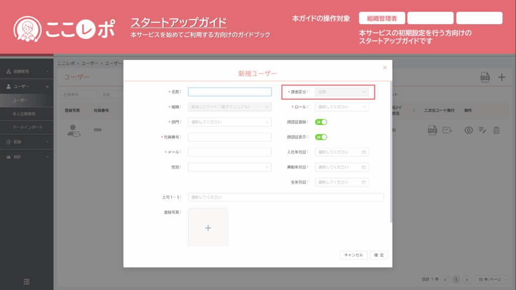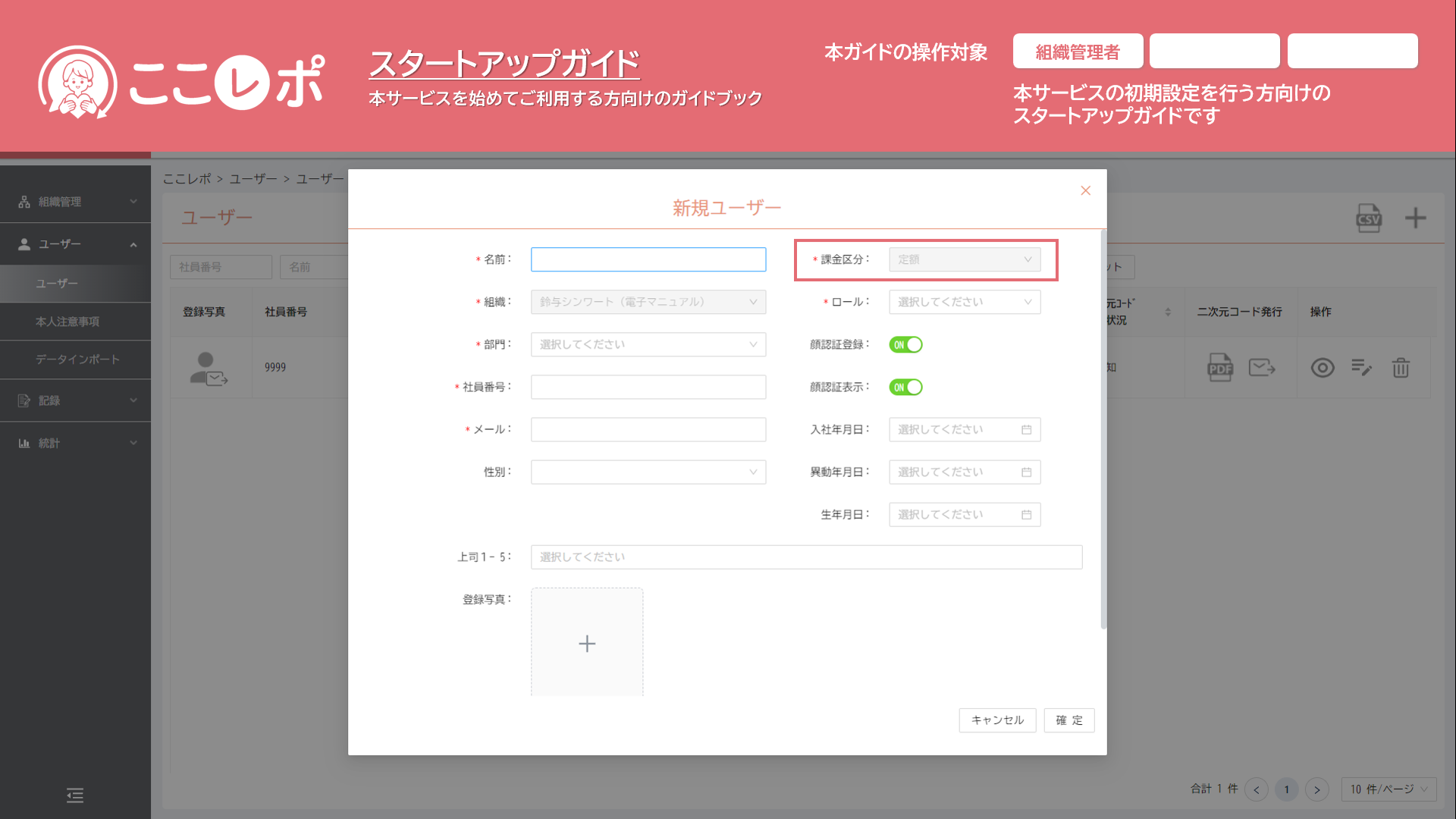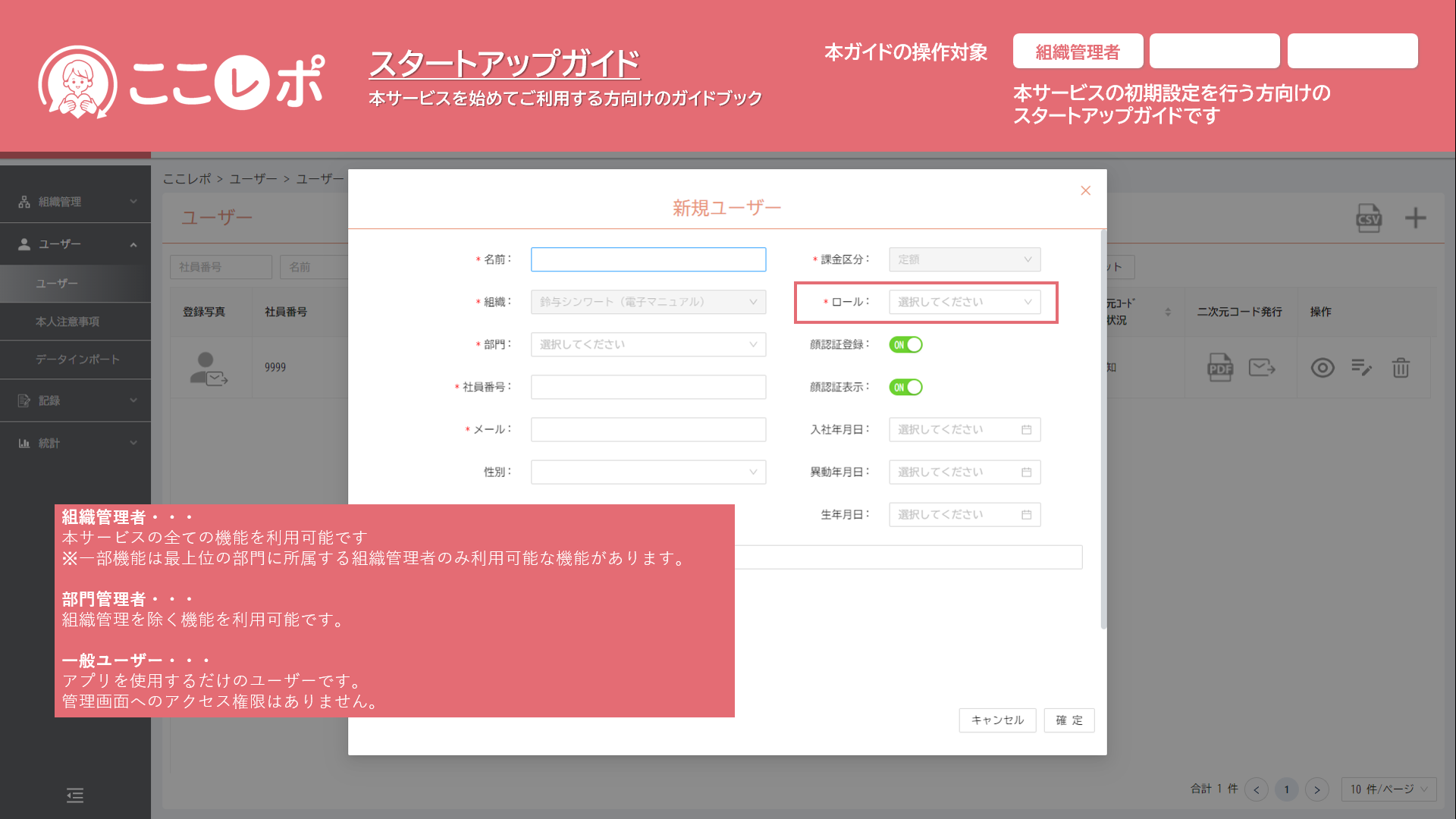 ユーザーの権限を設定します組織管理者、部門管理者、一般ユーザーから選択します。