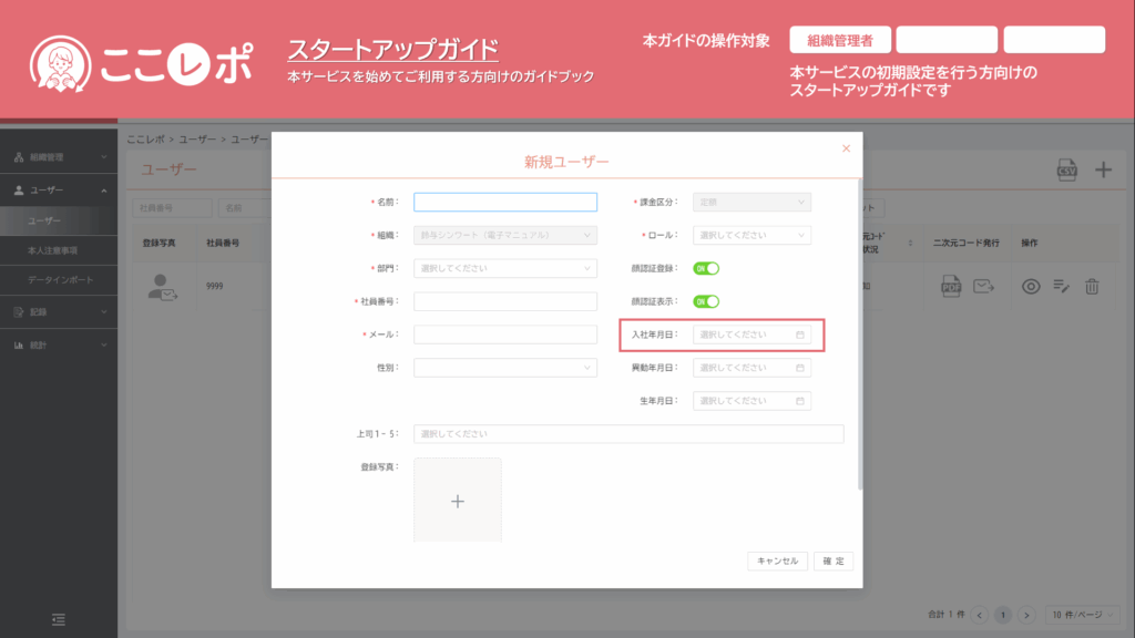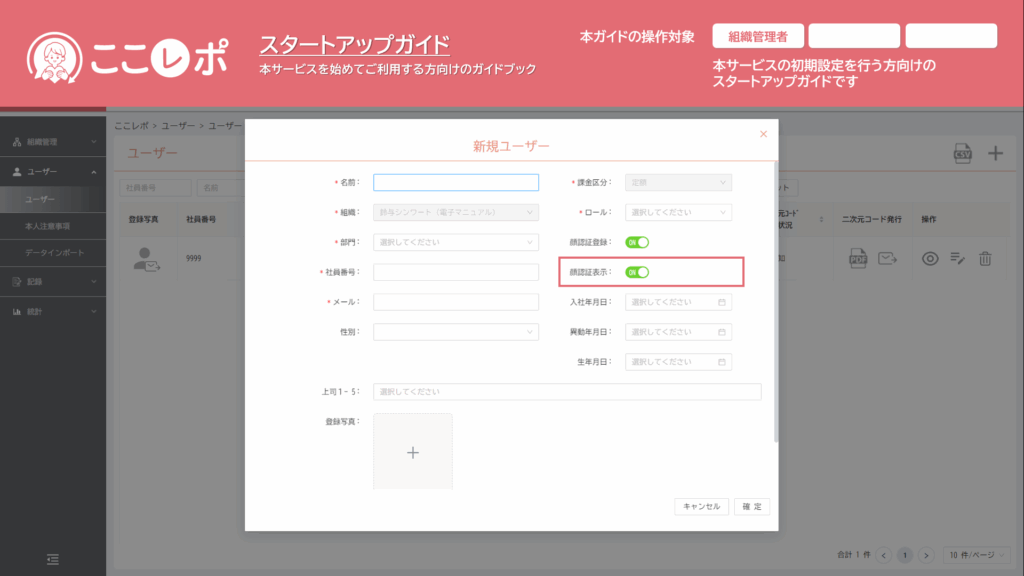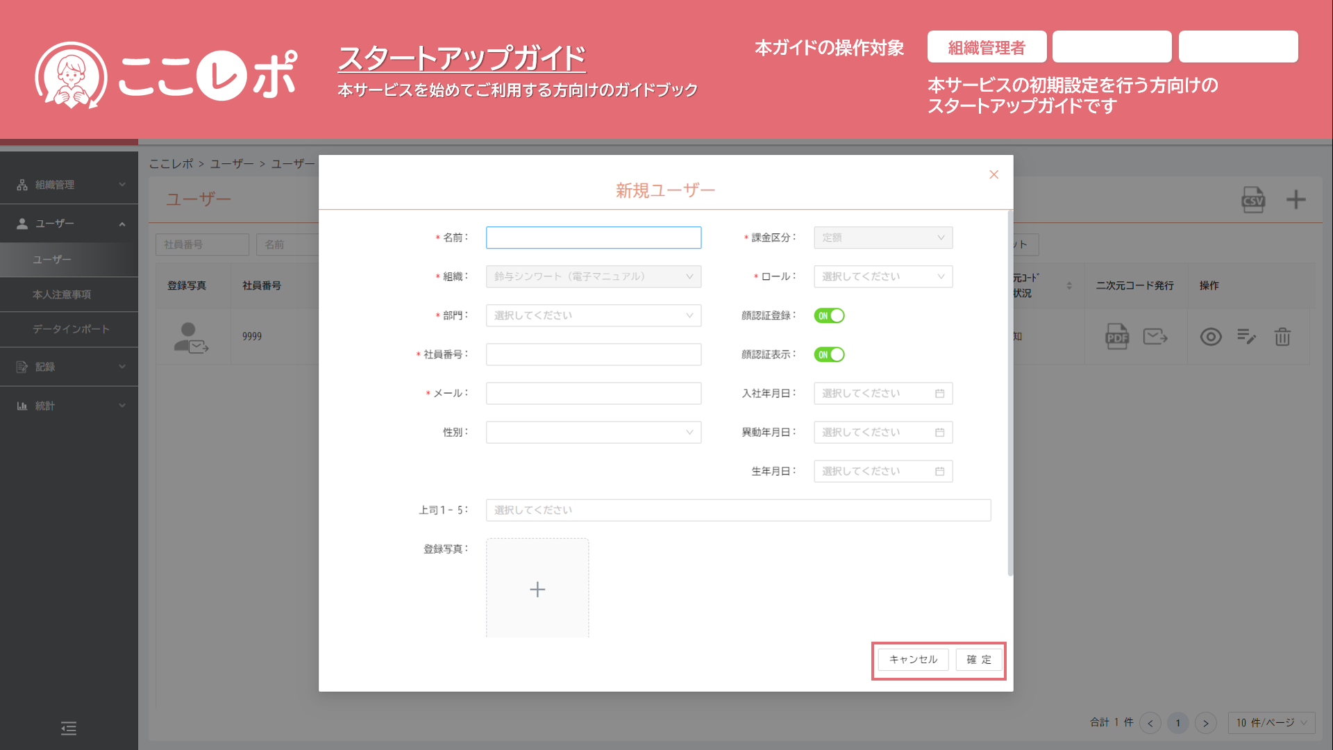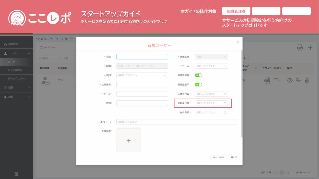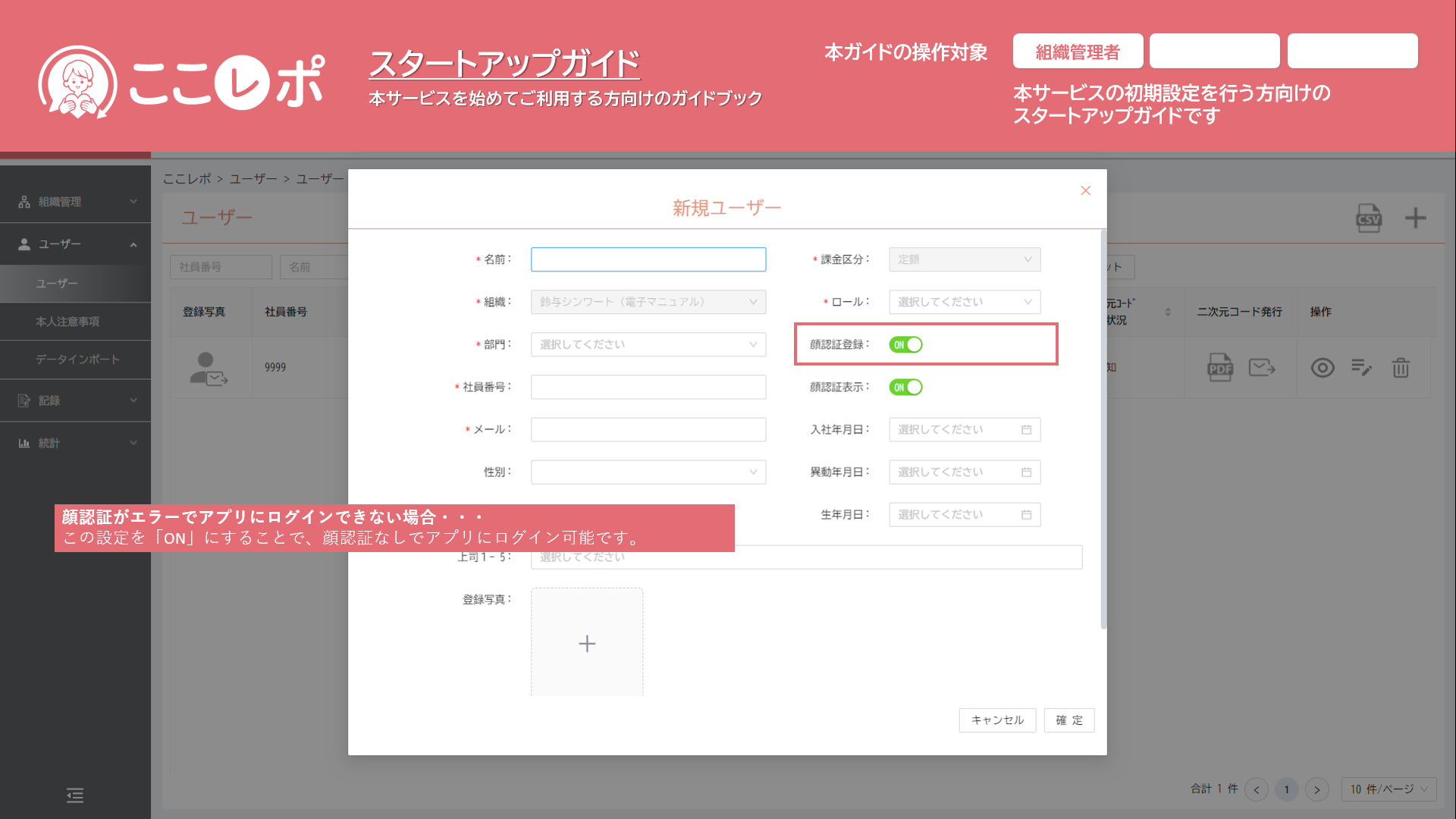 ユーザーの初期設定では、ユーザー作成後、ユーザーが行う顔写真の登録、アプリの初期登録について