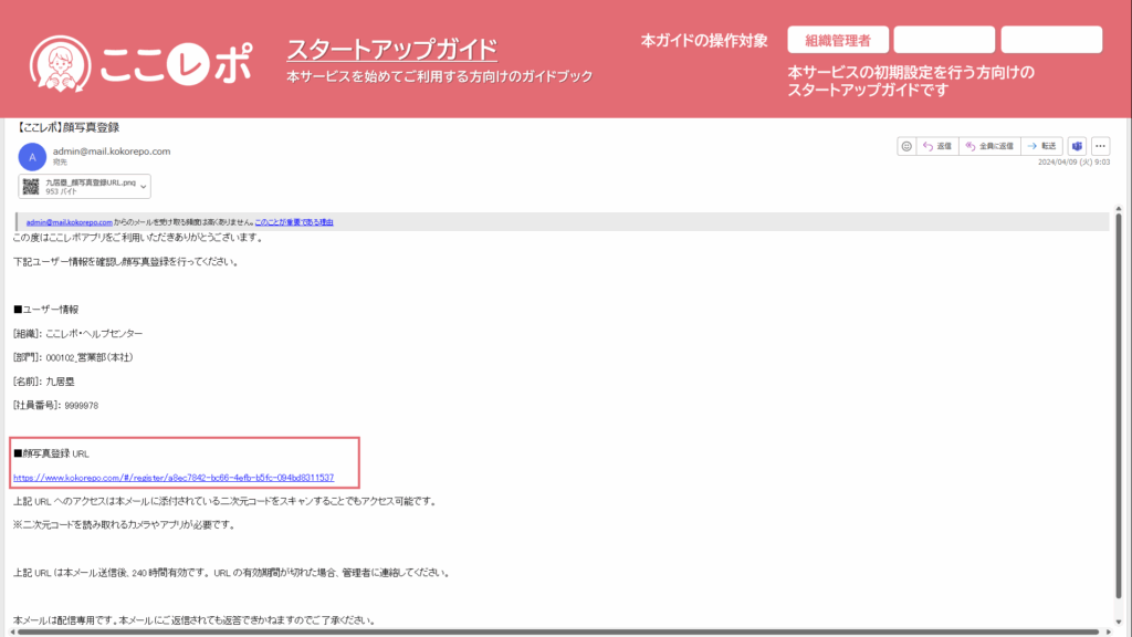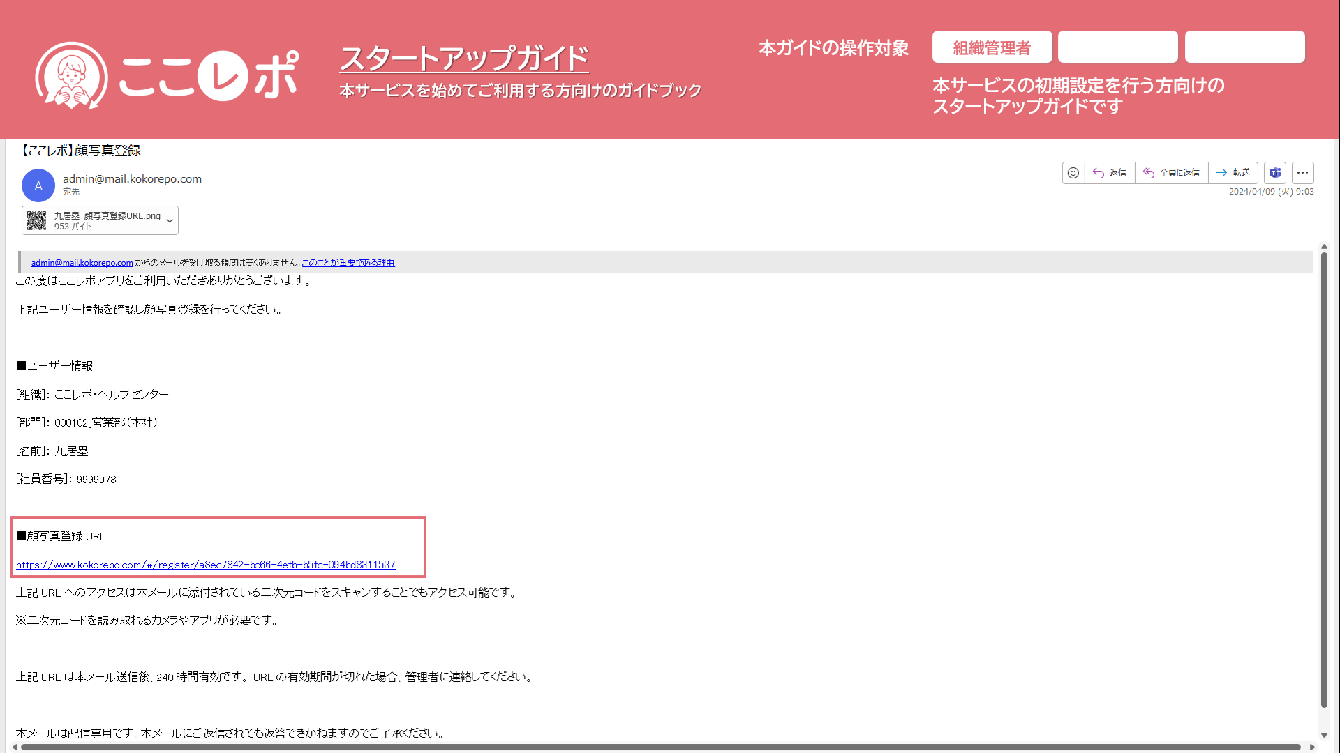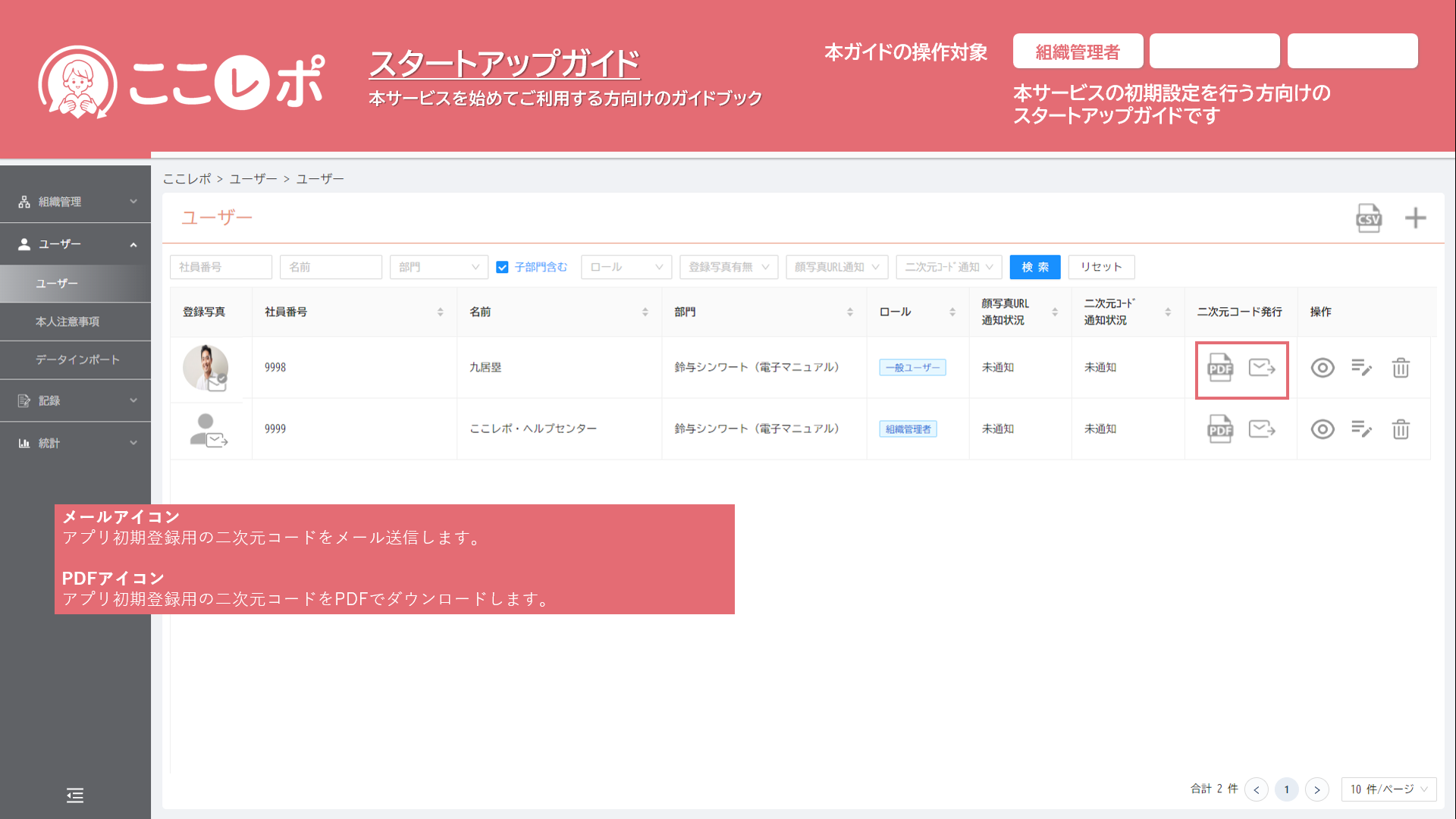 ユーザーが顔写真の登録を完了したら、「登録写真」欄に画像が表示されます。管理者は、次にアプリの初期登録を行うための二次元コードをユーザーに送信します。「二次元コード発行」欄にある「メール」アイコン、または「PDF」アイコンをクリックします。
