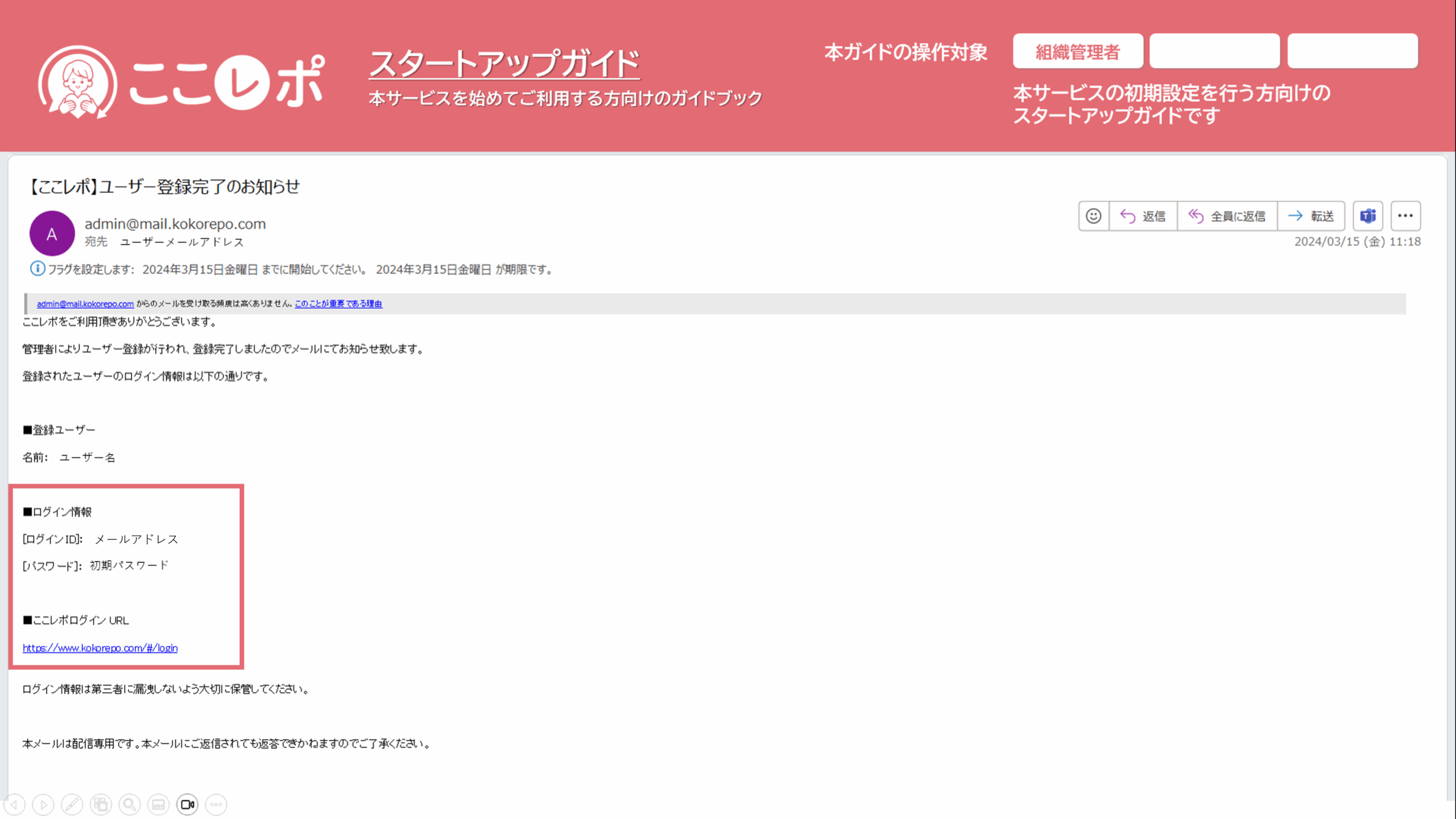 「ここれぽ」ユーザー登録完了のお知らせ」というメールが届きます。