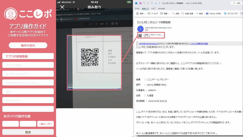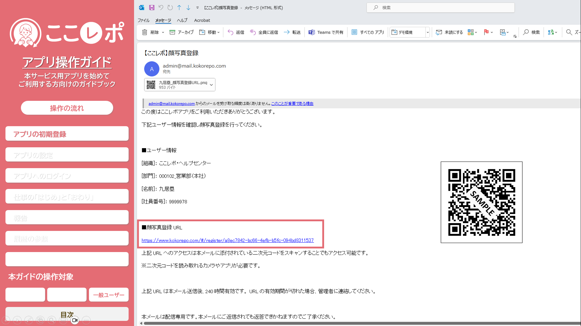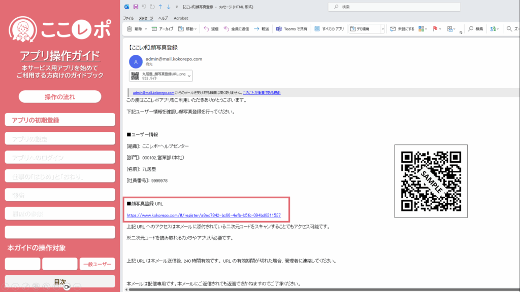顔写真の登録が完了したユーザーには、次に「ここれぽ、二次元コード初期登録」という件名のメールが届きます。