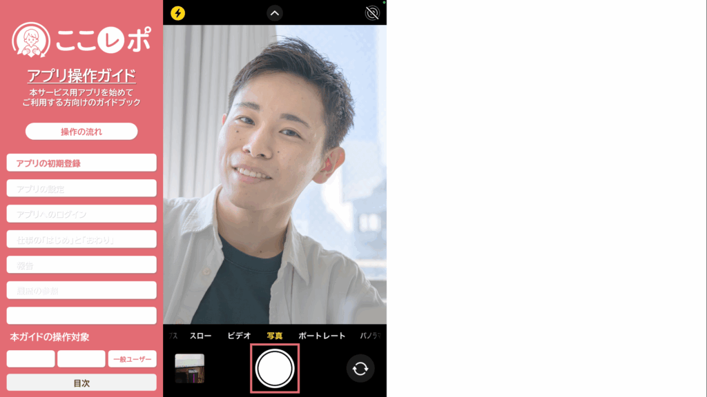 インカメラが起動したら、ユーザーの顔をカメラに映してシャッターを切ります。この際、あまりアップで撮影しないよう、肩が入るくらいの引き気味で撮影してください。