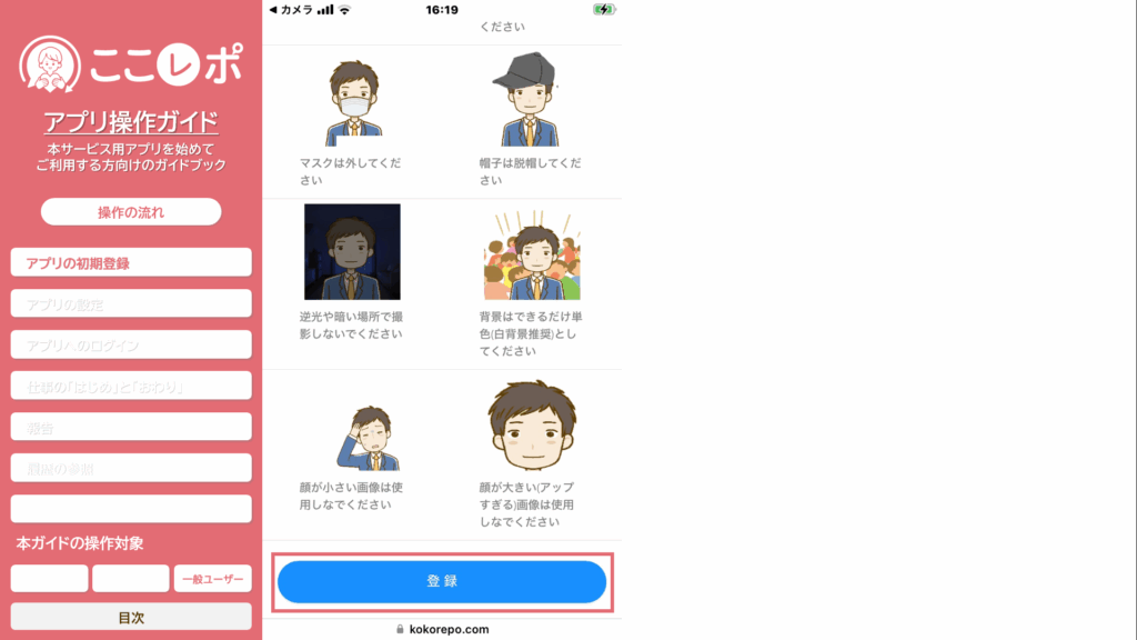 画面を下にスクロールすると、「登録ボタンが表示されます。撮影した画像を登録する場合は、「登録ボタンをタップします。