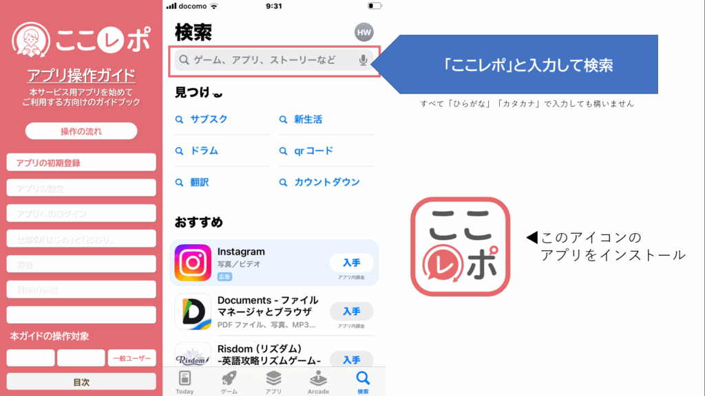 「ここレポ」アプリの使い方について以下のURLでご確認いただけます