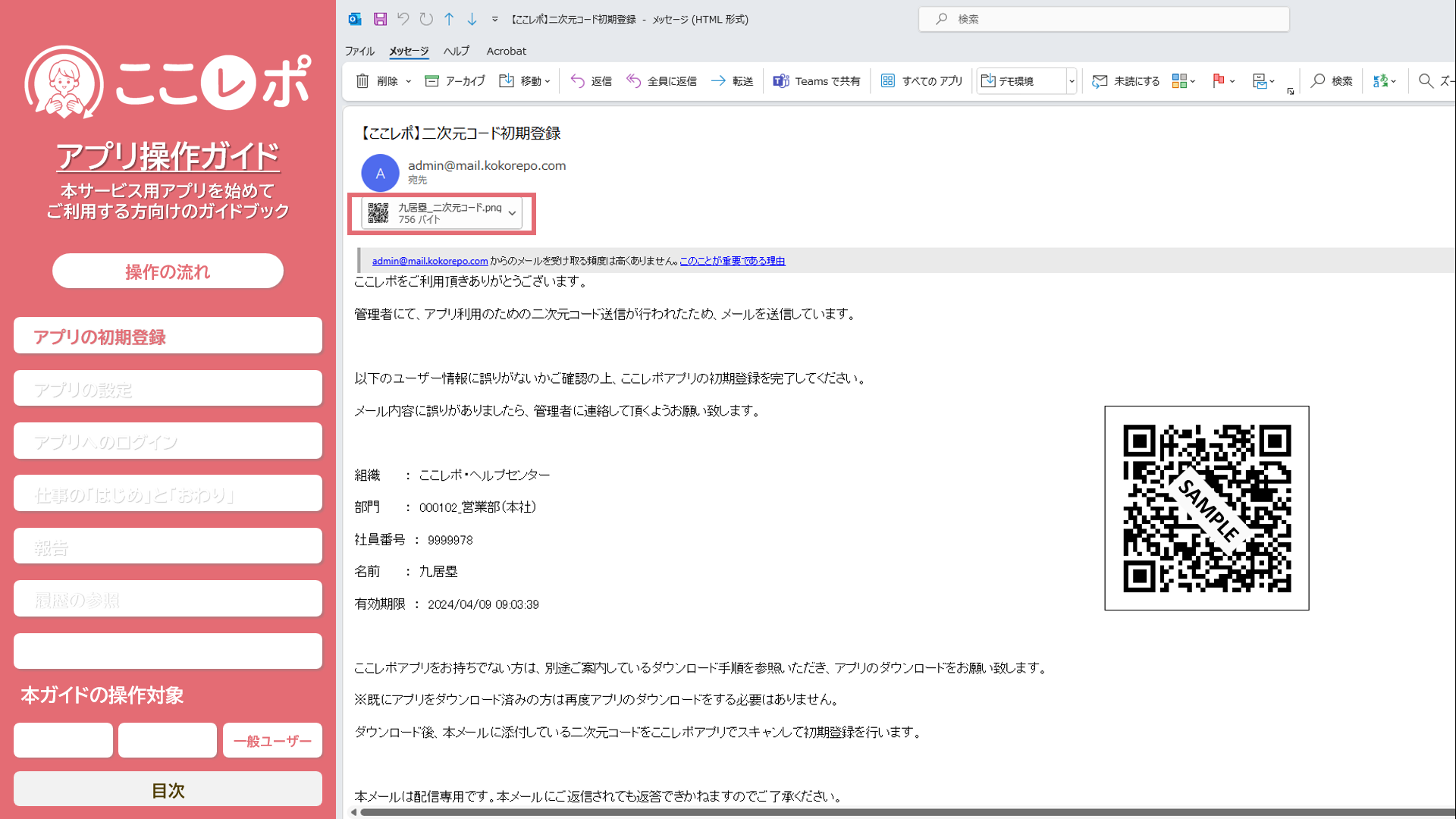このメールは、管理者が管理画面から送信を行います。もし届かない場合は、管理者に送信を依頼してください。このメールに添付された二次元コードを使用して、本サービス用アプリの初期登録を行います。