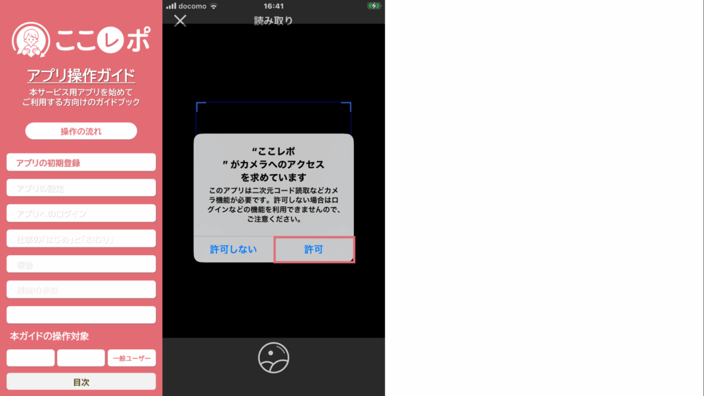 初期登録の途中、カメラ、GPSなどの使用許可を求めるウィンドウが表示されます。「OK」または「許可」などで画面を進めてください